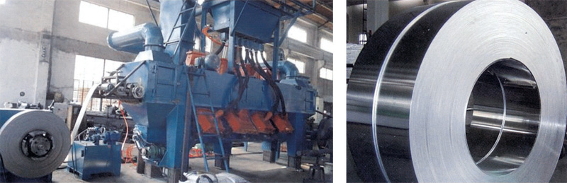 帶鋼經開卷人工送至夾送帶鋼拋丸機上,穿過拋丸清理室,至收卷。利用高效懸壁離心式拋丸器將彈丸高速拋射到被清理工件表面上。對工件進行沖擊刮削,以清除工件表面的鐵銹、氧化皮及其它污物。然后利用鋼絲刷、吸氣管將工件表面的浮塵吸干凈。從而達到提高鋼帶的抗腐蝕能力、抗疲勞性能、延長其使用壽命、優化鋼帶的表面工藝狀態。本機既可單機使用,亦可組線使用。